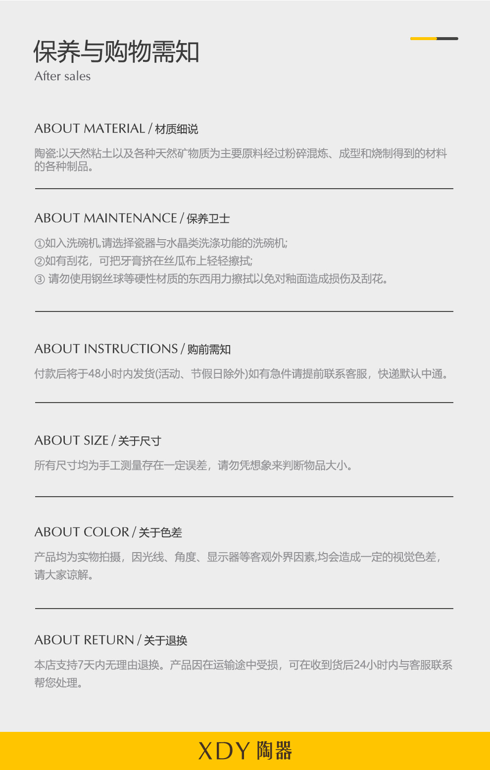 3.关于验收:陶瓷属于易碎产品,到货48小时内发现破损请联系客服,可补发退款或下次订单中补发,超过48小时由于无法辨识责任请自行处理。